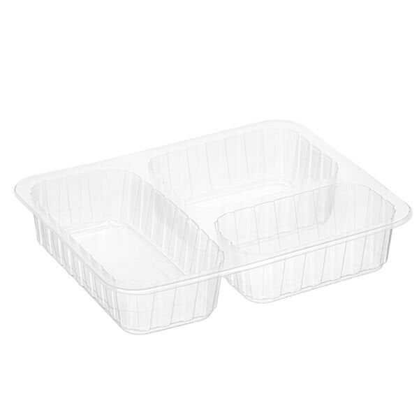 17,8 x 22,2 x 4,2 cm ebatlarında 3 bölmeli, şeffaf renkte, plastik, ısıya dayanıklı kullan at gıda kabıdır. Polipropilen (PP) malzemeden olması sebebiyle mikrodalgaya ve gıda ile temasa uygundur. BOPP film ile üstü ısıtma kapatmaya uygundur.