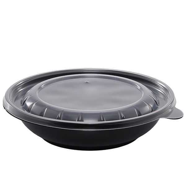 Policap marka, 18 cm çapında, 4 cm yüksekliğinde, 500 gr iç hacimli, yuvarlak, sıcağa dayanıklı, siyah renkte, tek kullanımlık, plastik gıda kabıdır.