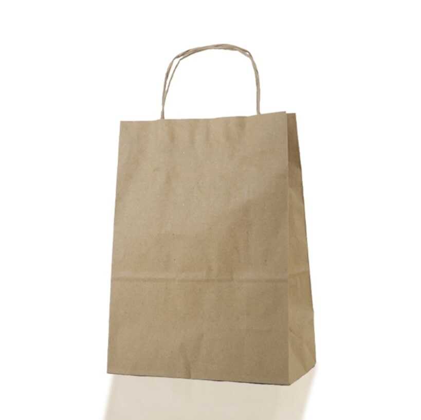 19 cm eninde, 24 cm boyunda ve 10 cm taban genişliğinde, baskısız, bükümlü saplı, 100 gr kağıttan kaliteli, mini boy naturel kraft kağıt çanta.
