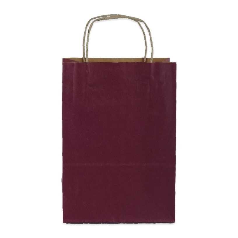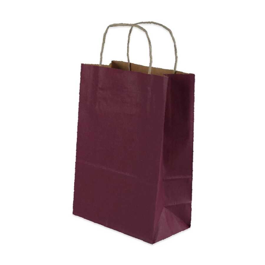 19 cm eninde, 24 cm boyunda ve 8 cm taban genişliğinde, baskısız, bükümlü saplı, 100 gr kağıttan kaliteli, mini boy ( Mor ) kraft kağıt çanta.