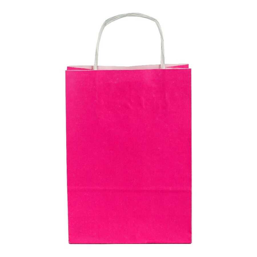18 cm eninde, 24 cm boyunda ve 8 cm taban genişliğinde, baskısız, bükümlü saplı, 100 gr kağıttan kaliteli, mini boy ( PEMBE ) kraft kağıt çanta.