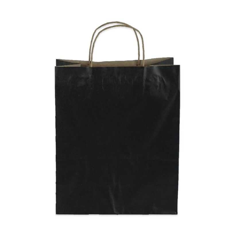 19 cm eninde, 24 cm boyunda ve 8 cm taban genişliğinde, baskısız, bükümlü saplı, 100 gr kağıttan kaliteli, mini boy ( Siyah ) kraft kağıt çanta.
