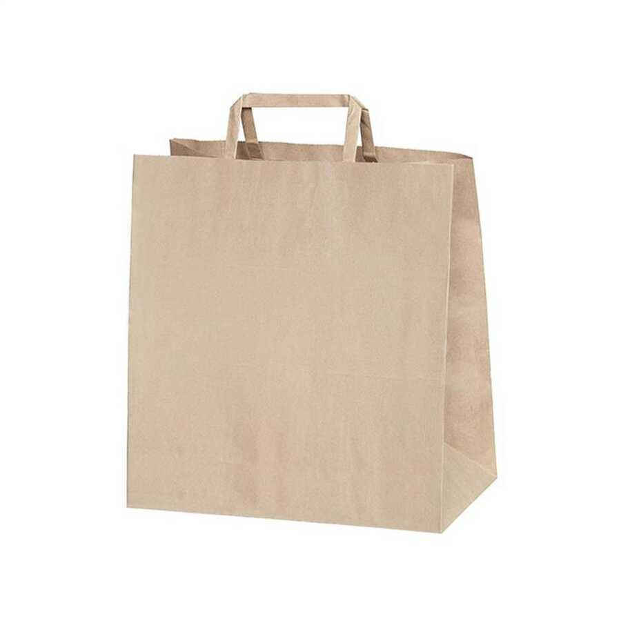 22 cm eninde, 26 cm boyunda ve 10 cm taban genişliğinde, baskısız, flat saplı, naturel kraft kağıt çanta, hediyelerinizi en güzel şekilde sunacağınız, dayanıklı ve şık taşıma çantasıdır.