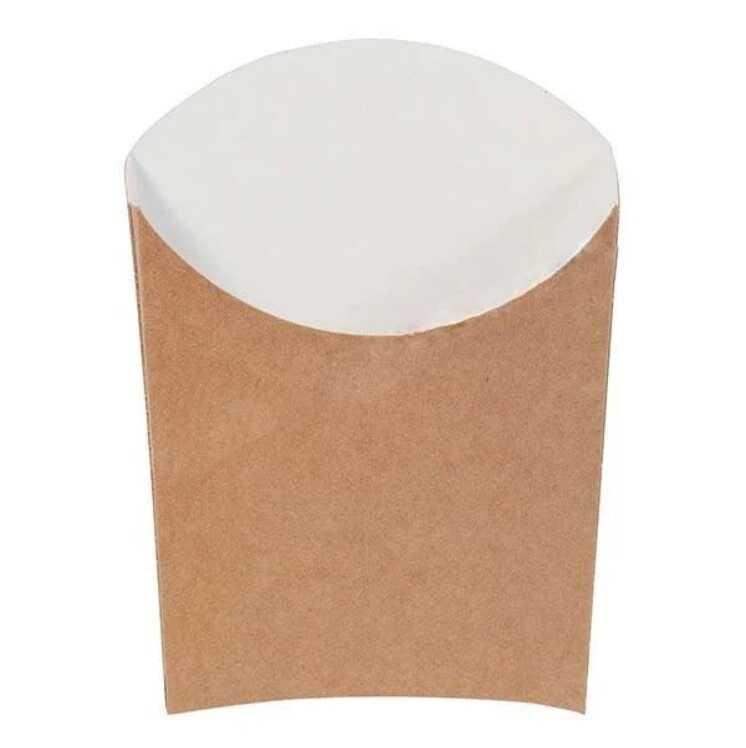 14 cm eninde, 9 cm yüksekliğinde, içi beyaz renkte dışı doğal kraft kağıttan, tek kullanımlık, karton cips (patates) kutusudur.